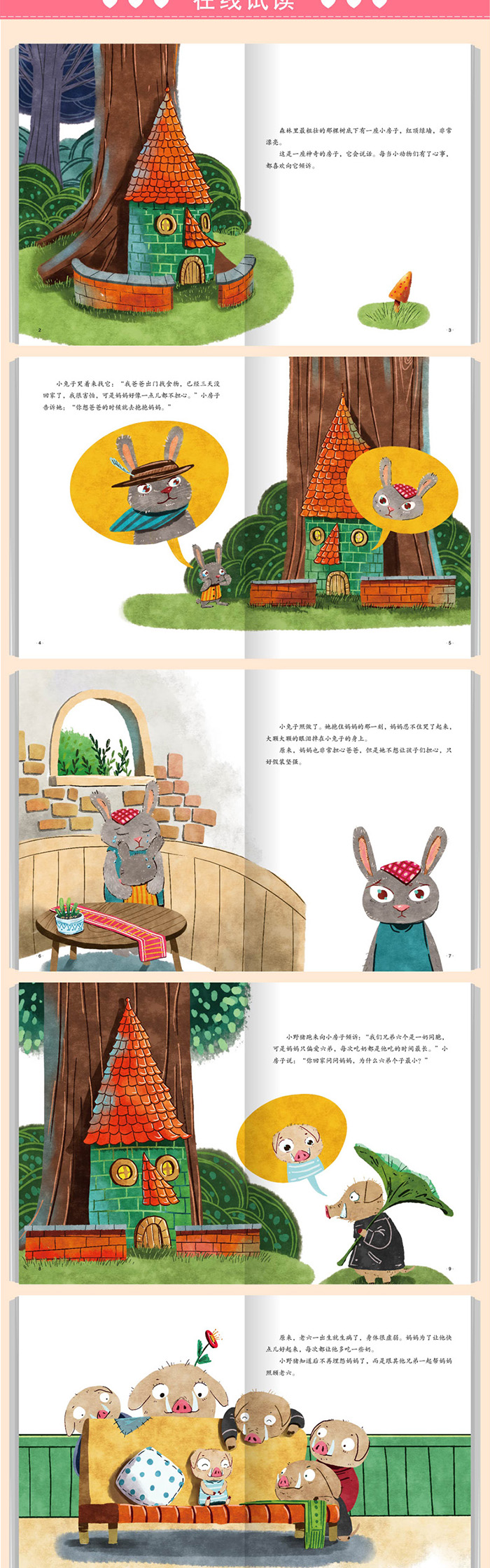 这是一本儿童图画故事书。森林里有座会说话的小房子,小动物们有了心事都喜欢跟它说。它帮小兔子、小野猪、小燕子解决了他们的疑惑和担忧。有一次小猫咪来到小房子前遇到了危险,松鼠妈妈从里面冲出来救了小猫咪。这下大家才知道,原来森林里的妈妈们会轮流来小房子里说话,帮助孩子们解决各种难题。