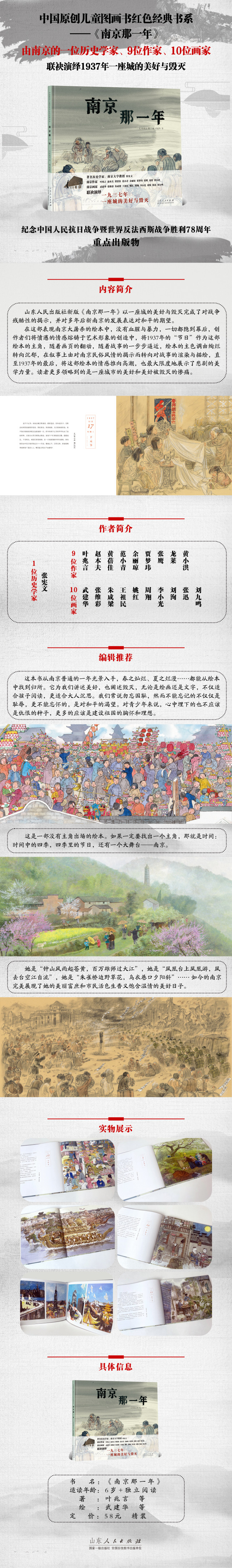 这本书从南京普通的一年光景入手,春之灿烂、夏之烂漫……都能从绘本中找到归所。它为我们讲述美好,也阐述毁灭,无论是绘画还是文字,不仅适合孩子阅读,更适合大人沉思。我们常说勿忘国耻,然而不能忘记的不仅仅是耻辱,更不能忘怀的,是对和平的渴望。对青少年来说,心中埋下的也不应该是仇恨的种子,更多的应该是建设祖国的胸怀和理想。 这是一部没有主角出场的绘本。如果一定要找出一个主角,那就是时间:时间中的四季,四季里的节日,还有一个大舞台——南京。
