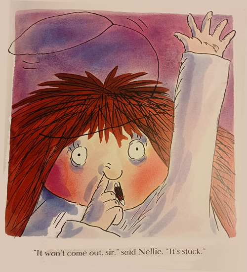 小女孩Nelie有一个漂亮的鼻子但是由于她喜欢挖鼻孔,手指被困在鼻孔里弄不出来。后来寻求老师,妈妈,魔法师,消防员,科学家等人帮忙,依然手指还卡在鼻孔里。