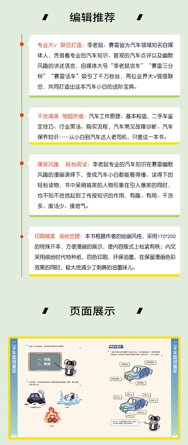 ◆爆笑风趣 轻松阅读:李老鼠专业的汽车知识在赛雷幽默风趣的漫画演绎下,变成汽车小白都能看得懂、读得下的轻松读物,书中呆萌搞笑的人物形象在引人爆笑的同时,也不知不觉地起到了传授知识的作用,有趣、有用、干货多、废话少、接地气。