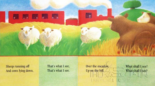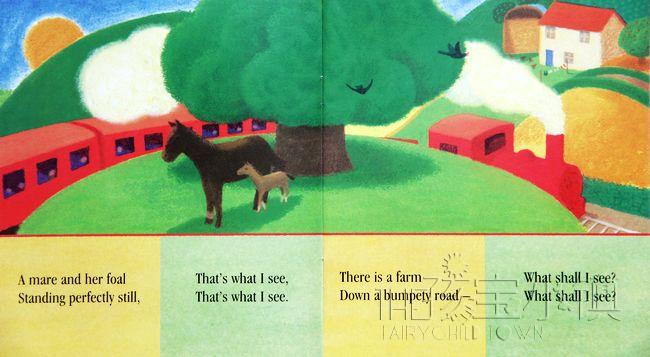 对孩子来说,搭火车是一个新奇又美好的经验。小女孩和妈妈要去拜访外婆,两人兴奋地上了火车,小女孩带着热切的眼神看着窗外,以满怀期待的心情和妈妈玩起猜测下一幕的风景是什么的游戏,山坡上的牛羊?河边的白鹅?还是天空中的热汽球?火车终于缓缓停了下来,母女开心结束了一场亲子温馨互动的对话,笑咪咪的外婆也早已在车站外等候了! 文句简洁有力,如诗如画的图,使整个阅读弥漫着一股清新的香味。