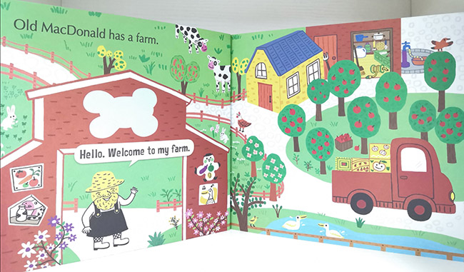 爷爷的农场里养着各种各样的动物:奶牛冲他“哞哞”叫,小猪“哼哼”地要食吃,小羊“咩咩”唱着歌,真是一个热闹又有趣的农场。