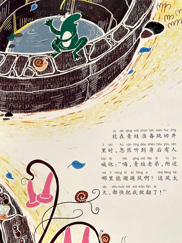《井底之蛙》绘本是根据《庄子·秋水》的一个典故进行新编,讲述了一个小故事:从前有一只住在井底的青蛙,过着幸福快乐的生活。有一天暴风雨时,它遇到一只路过躲雨的海鳖,于是邀请海鳖来自己家的大房子躲雨,它还热情地劝说海鳖留下来定居,因为它觉得这里实在太大太舒服了,很适合居住。可海鳖谢过它后,并没有留下来,因为海鳖想念它的大海了……本绘本用优美可爱的绘本语言和美丽的插画,告诉孩子们,井底之蛙是很可悲的,我们要引以为戒,开放眼光。