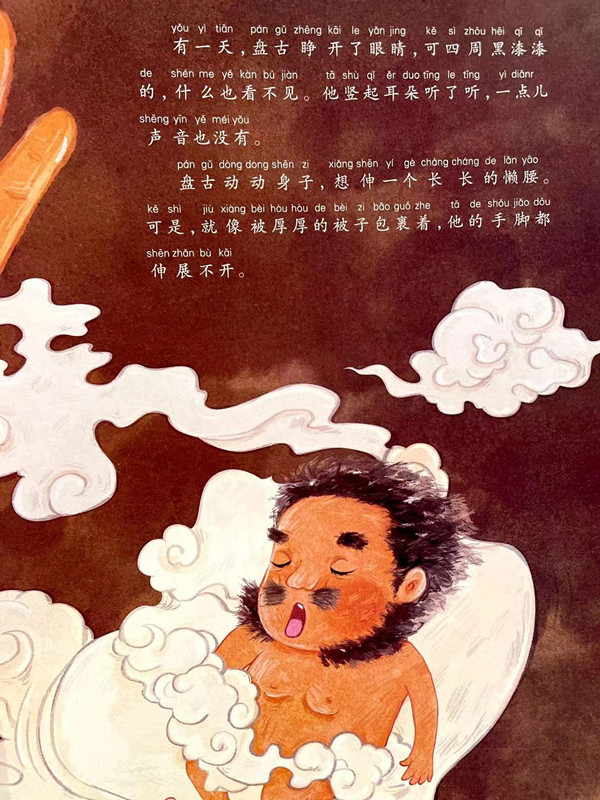 很久很久以前,有个叫盘古的巨人,拿着一把大斧将混沌的宇宙劈开了,然后头顶天脚踩地支撑了好多好多年,才将天和地分开来。盘古死后,他的身体渐渐和天地融为一体。他的左眼变成了太阳,右眼变成了月亮,头发和胡须变成了星星,身躯变成了高山,筋脉变成了道路,血液变成了江河。盘古也因此成为最伟大的神。