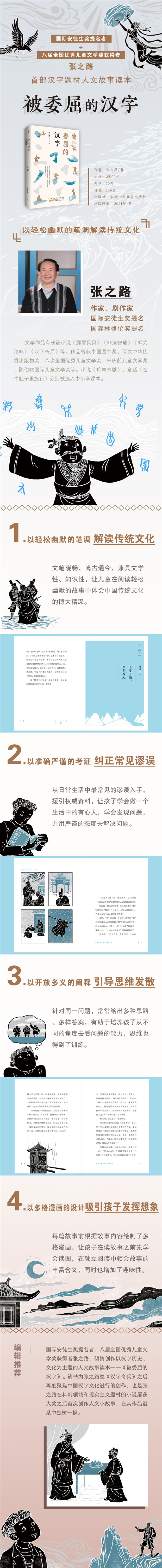 本书是著名儿童文学作家张之路继《汉字奇兵》之后再度聚焦中国传统文化,以汉字为主题创作的有关汉语词汇知识的趣味读物。 作者的创作立意为“每一个汉字都有自己的生命和灵魂,有悲欢离合和喜怒哀乐,甚至有聪明的,也有受委屈的。作品从现实生活的角度选择一些容易被现代人误读或错解的字词,加以准确、权威的解释,以文学之笔写人文故事,以轻松笔调还原汉字世界被忽略的历史风貌,通过生动的形象、有序的编排、风趣的解读,把这些汉字描述得活灵活现、栩栩如生,串联历史,映照当下,讲述其前世与今生的故事,兼具文学性、故事性、人文性、科普性。让小读者在轻松阅读的同时既能理解和把握这些字词,又能激发他们热爱和探究汉语知识乃至中华文化。