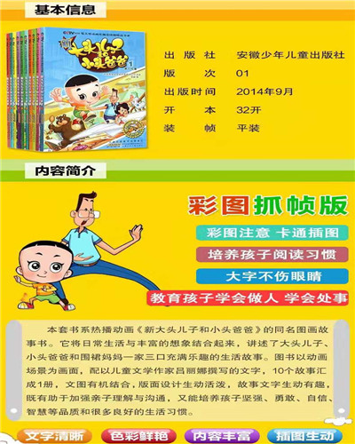 本套书系热播动画《新大头儿子和小头爸爸》的同名图画故事书。 它将日常生活与丰富的想象结合起来,讲述了大头儿子、小头爸爸和围裙妈妈一家三口充满乐趣的生活故事。图书以动画场景为画面,配以儿童文学作家吕丽娜撰写的文字,10个故事汇成1册,文图有机结合,版面设计生动活泼,故事文字生动有趣,既有助于加强亲子理解与沟通,又能培养孩子坚强、勇敢、自信、智慧等品质和很多良好的生活习惯。