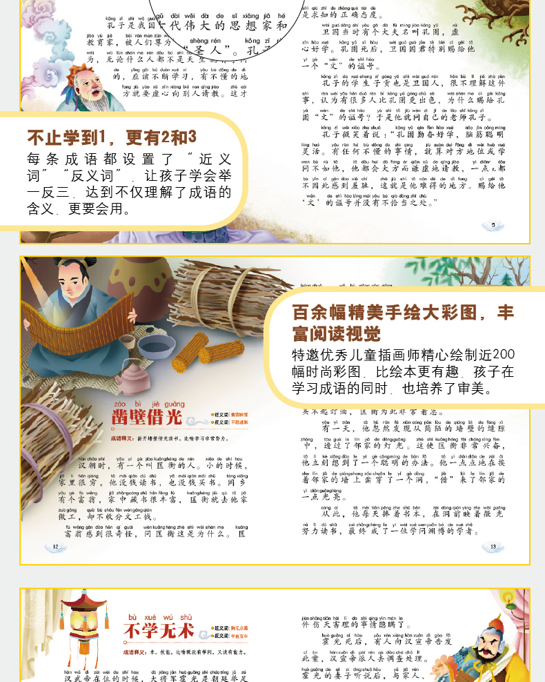 《中国儿童成语故事》一共4册,精心选取了上百个常见而熟悉的成语,主要通过 “成语故事”“成语释义”两个板块以及精美生动的手绘插图,来表现成语的出处和含义。此外,为了便于小读者独立阅读,我们依据新版《现代汉语词典》的拼音规范,对全文加注了汉语拼音,小读者在轻松阅读的同时不知不觉就加深了对成语的理解和认知。是一套适宜初学成语者的伴读书籍。