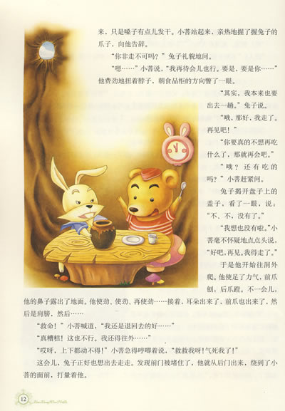 《小熊温尼·菩》是一部家喻户晓的经典童话。童话的主人公是一只名字叫温尼·菩的小熊,他的优点和缺点都那么可爱。温尼·菩特别贪吃,一天到晚总惦记着喝蜂蜜。他的脑子常常不够用,罗宾给他讲的知识,他总也理解不了。但他又特别善良勇敢,关键时刻常常想出令所有人赞叹不已的点子,帮助朋友脱离困境。最令人惊异的是小熊作诗的才华,他虽然没晗文化,却总能想比妙趣横生的诗句来。温尼·菩和好朋友罗宾、小猪、兔子、老驴灰灰……无忧无虑地生活在大森林里。他们一起经历了许多有趣的事情,闹了许多笑话,让人忍俊不禁。