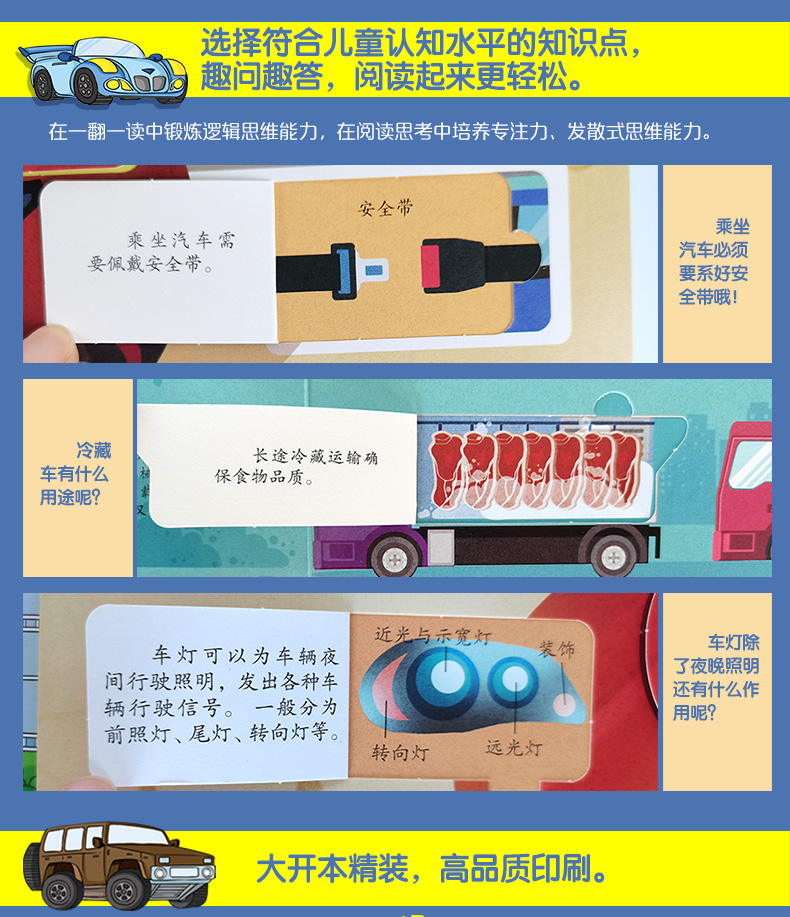 本书为小朋友介绍了关于汽车的各种知识,内容包括不同种类的汽车的特点(如轿车、卡车、救护车、赛车等)、汽车的发展史、汽车发展进程中的发明家事迹和对未来的汽车的展望等。本书针对5-10岁儿童,通过细致精美的插图、巧妙的翻翻设计,直观的呈现了汽车的相关知识,一方面让孩子感受丰富多样的现代生活,另一方面激发孩子对未来科技生活的大胆畅想。