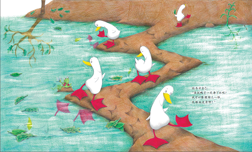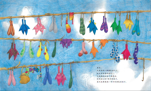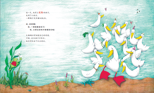 鸭子要穿袜子吗》题材新颖,讨论的话题能够引导孩子独立思考,培养他们的创新能力。彩铅的绘画风格让画面充满清新感,进一步凸显了文本中反复出现的色彩元素。从整体上看,该作运用了图画书常见的反复的叙事结构,又自然地融入了富有现代感的主题,是一部带有思辨色彩的佳作。