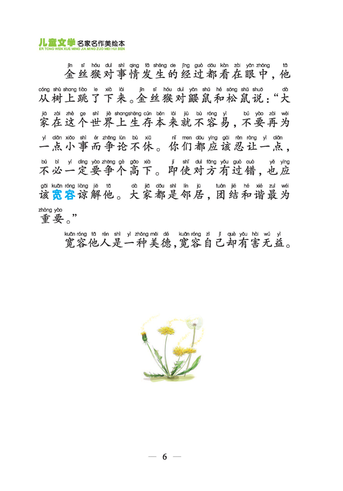 丛书选取了30位知名儿童文学作家原创的优秀儿童文学作品,有长篇的,也有短篇的,以寓言、童话故事为主,每位作家一本书,共30本。故事内容符合儿童心理特点。文中好的词语都变了颜色加以突出,加深读者对一些精彩词语的记忆,对于经常出现的多音字或变声字加点,巩固读者对拼音的掌握,并且随文附加一些引人思考的小问题,有利于启迪儿童智慧,培养儿童积极健康的思想品质。优秀的儿童故事配上精美的彩色插图,文图相映成趣,为孩子们以后的文学素养进行了一个良好的启蒙。