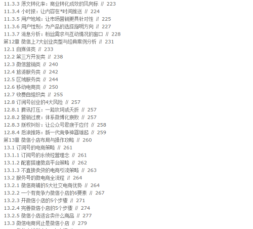 订阅号的电商策略和价值、微信小店的布局和全流程操作、微信电商引流的8个妙招、朋友圈的销售属性和卖货策略。