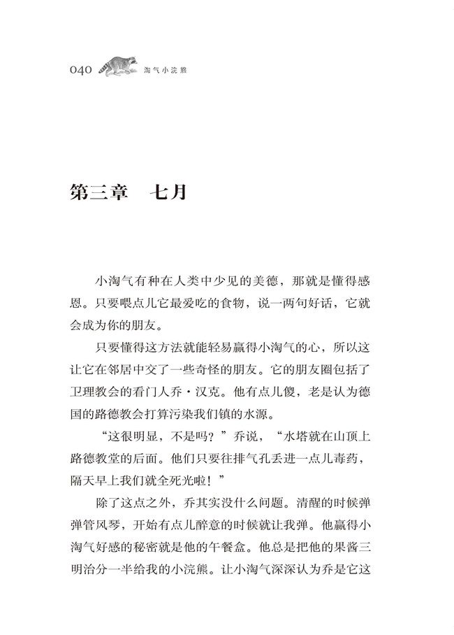 除了这点之外,乔其实没什么问题。清醒的时候弹弹管风琴,‘开始有点儿醉意的时候就让我弹。他赢得小淘气好感的秘密就是他的午餐盒。他总是把他的果酱三明治分一半给我的小浣熊。让小淘气深深认为乔是它这辈子遇到的最友善的人之一。