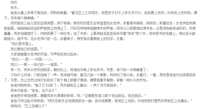 晋察冀边区北部有有一个小村子,一条还乡河在村前流过。河边长着许多芦苇,芦花开的时候,全村几十家就笼在芦花里。因此,这村叫芦花村。村里有个孩子顽皮大胆,尤其是水性很好,他就是雨来。