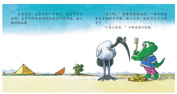 《谁的牙齿最漂亮——尼罗河畔的刷牙节》喜欢吃甜食的小鳄鱼,总是让小鸟给它清洁牙齿。终于有一天小鸟忍受不了离它而去了。过了不久小鳄鱼收到了一个包裹,里面有小鸟给它寄来的牙刷和牙膏,其它动物们看见了都对这两个怪东西产生了浓厚的兴趣。