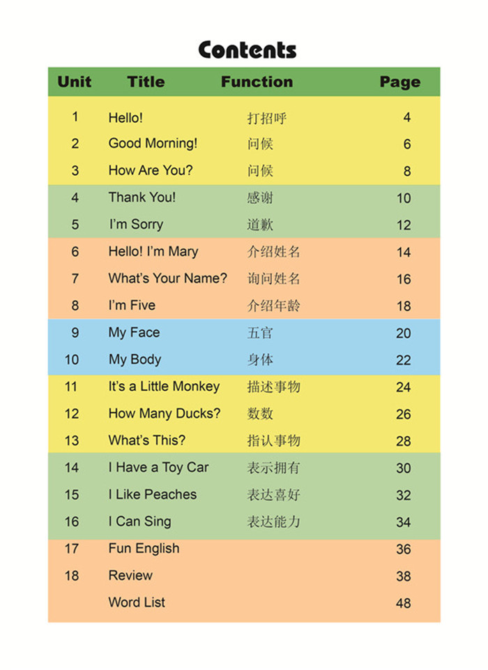 本教材分上、下两册,编有36个(上、下册各18个)教学单元,从零起点的学龄儿童建议学时90。也适用于亲子英语启蒙或培训机构任何英语课程的入门教程,建议3-6个月。