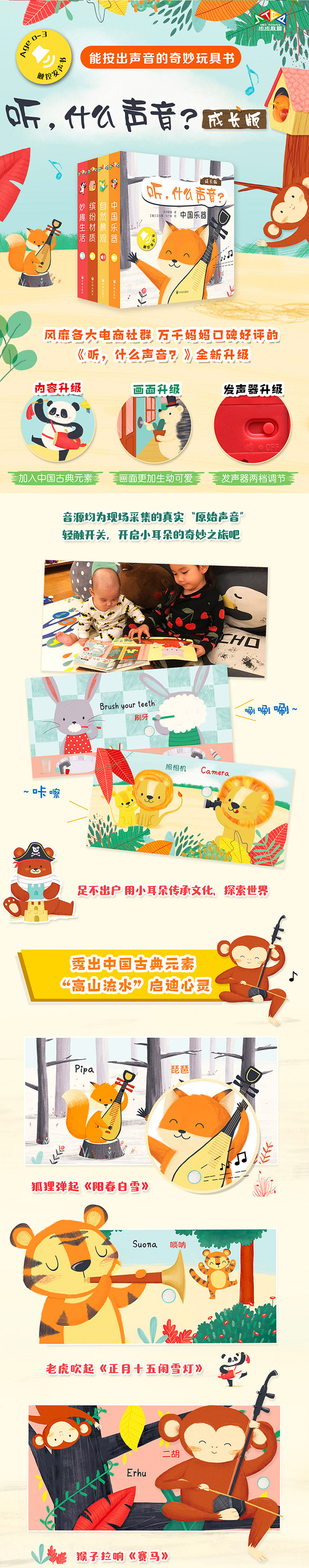 ● 风靡各大母婴自媒体社群、电商平台,万千妈妈口碑好评的触控发声书《听,什么声音?》的全新升级版——《听,什么声音?成长版》来啦!