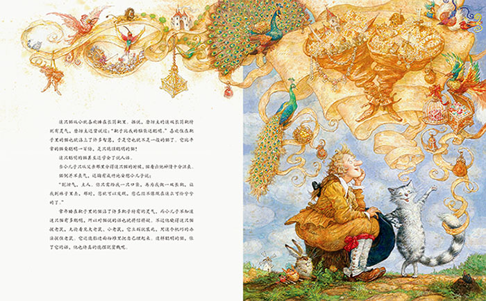 流传三百年的法国经典童话,一只狡黠机智的猫改写了自己和主人的命运。磨坊主去世了,小儿子除了分得一只猫外一无所有。可这只聪明的猫穿上长筒靴,用智谋换取了国王和公主的好感,消灭了食人巨妖,让小儿子迎娶了公主,自己也过上了好日子。整篇故事向儿童传递着一种希望——即使再卑微弱小的人也能成功。俄罗斯插画家安东·罗马耶夫将其精心绘制成一场鲜活的童话剧,完美展现了佩罗童话崇高与滑稽、奇幻与质朴并存的特质,想象力极其丰富,色彩绚烂夸张。
