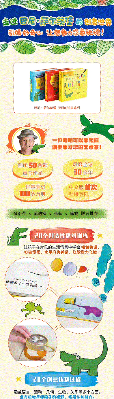 ★《美丽的错误,无限创意》:微笑的种子可以变成花园,小小的鱼缸变成了海洋,狗狗的尾巴变成有趣的故事书,把好奇心变成大发现,把白日梦变成好玩儿的东西…...创意大师巴尼告诉读者如何将普通的东西变得非同寻常,发挥无限创意,观察周遭与自然,为艺术创作奠定坚实的基础。 ★《美丽的错误,动动手,成为一名创意大师》:通过各种折叠、撕裂、打孔、弯曲、脏污等,跟随创意大师巴尼一起脑洞大开,在一张撕碎的纸上写完一首诗来制作一首诗, 把不小心滴漏的墨汁变成一件艺术品,利用废弃的纸团和报纸进行自由创作......这本书会成为读者独一无二的创意作品。