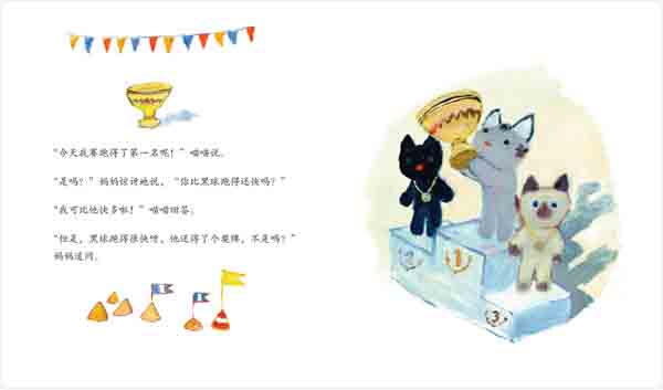 书中喵喵给爸爸妈妈讲了当天他在幼儿园里发生的事,可是实际上我们知道这些都是喵喵自己在爸爸妈妈的提问下编出来的一个个小故事。虽然有些情节在我们看来是不现实的,但却充满了条理性,换句话说他可以自圆其说,比如,在《寻宝藏》一书中,喵喵说他发现了一个宝藏,爸爸说你今天不是上学吗?怎么有时间去挖宝藏?于是,喵喵说埋宝藏的小岛离学校很近,就在教室后面。接着爸爸又问他怎么不知道教室后面还有条河呢?喵喵回答说那条河才出现没多久,所以你不知道。细细分析,喵喵的话是有因果关系的,他会随着爸爸的提问,不断让自己的故事更加完善。而这个过程恰恰锻炼了孩子的逻辑思维和表达能力。
