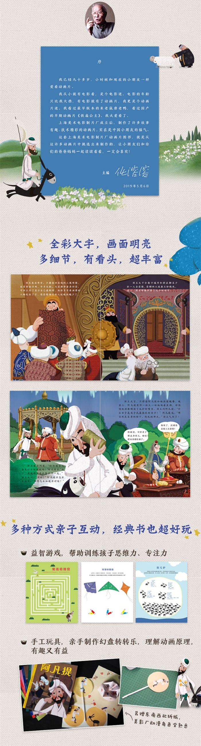 全书根据上海美术电影制片厂于1980年发行的木偶动画电影《阿凡提的故事》改编,共有6册,收录了14个人们耳熟能详的关于阿凡提的故事。 上海美术电影制片厂