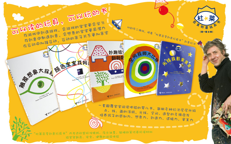 《杜莱百变创意玩具书》是一套有多种游戏元素和玩法的百变创意玩具书,是*创新性的法国童书大师埃尔维杜莱的代表作品。他将不同颜色、材料、形状甚至光线作为游戏元素设计进书中,用触摸、翻翻、投掷、猜猜等百变玩法打通宝宝观感,点、线、面的涂鸦,光线、空间、造型的多维启发,培养宝宝感知、逻辑、想象、创造、空间能力。