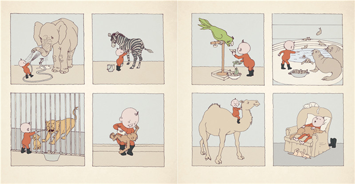 ★复古漫画:以浅棕色复古连格漫画形式处理小男孩的想象,符合小男孩爱读漫画的年龄特点。