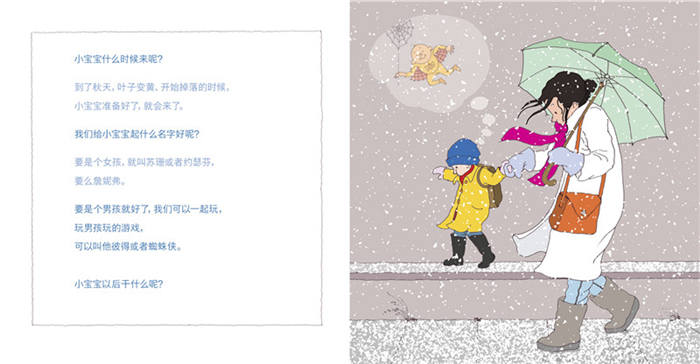 小宝宝什么时候来呢?——小宝宝准备好了就会来了,会在秋天。给小宝宝取什么名字呢?——要是个女孩,就叫苏珊或者约瑟芬,要么詹妮弗;要是个男孩,可以叫他彼得或者蜘蛛侠。小宝宝长大后干什么呢?——也许,小宝宝会当上大厨或者园丁;也许小宝宝会在动物园工作,也许小宝宝会当医生或者护士……通过小男孩和妈妈的谈话,展现小男孩对弟弟妹妹的即将到来,既充满不安,又心怀期待。