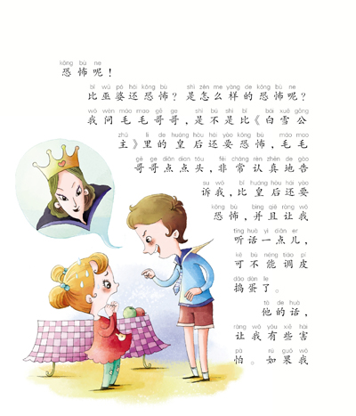 我问毛毛哥哥,是不是比《白雪公主》里的皇后还要恐怖,毛毛哥哥点点头,非常认真地告诉我,比皇后还要恐怖,并且让我听话一点儿,可不能调皮捣蛋了。