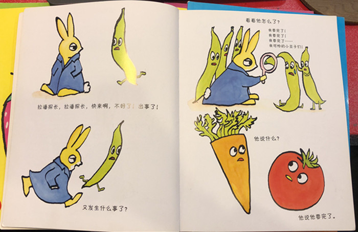 这个四季豆完全是有“公主病”的嘛!开始的时候,不停说着,我完了,我完了,我完了。大家都快崩溃。拉潘探长将它单独请到一边,开导他。四季豆没完没了的说啊,说的兔子拉潘都睡了一觉。说完它觉得自己好了,结果又开始自恋了,大家更受不了,只想将它炖了吃了。整套故事都非常有趣。