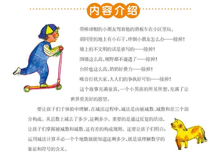 这个故事充满童真,一个小男孩的所见所想,充满了让世界更美好的愿望。要让孩子们于体验中理解,在减法过程中,减法是由被减数、减数和差三个部分构成。从总数上减去了多少、还剩多少。重要的是通过反复的活动,让孩子们掌握被减数和减数、还有差的构成规则。还要让孩子们明白:运用减法计算不必一个个地数就能知道还剩多少,就是说理解数学的象征和符号的含义。