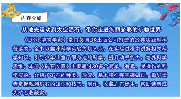 《DK小博物学家》是由英国DK出版公司打造的经典实践型科普读物。全书以趣味科学实验为切入点,在实验过程中讲解相关科学知识,引导少年儿童了解身边的科学,提升动手能力,培养科学思维。本册《矿石收藏》主要通过30多个简单、有趣、易操作的科学实验,介绍了矿石的种类、形成、基本特征等基础知识,指导读者掌握观测矿石的知识和技巧,制作、收藏岩石标本,帮助读者成为矿石收藏家。