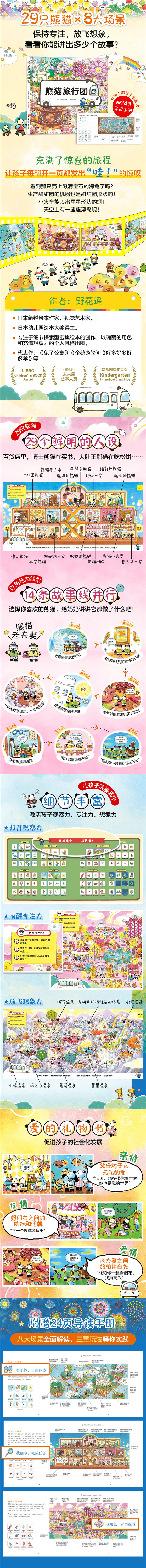 本书描绘了一场29只小熊猫的梦幻旅行,每个小熊猫都有自己鲜明的特点。旅行涉及八大观光地,包括了深海隧道、甜品工厂、彩虹温泉、星星游乐园等充满童趣的场景。书中还设置了多项任务,可以让小读者们在享受图文之美的同时,锻炼专注力与逻辑思维。
