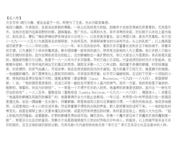 《名人传》由贝多芬、米开朗琪罗和托尔斯泰三位名人的传纪组成,他们都是人类历史上极富天才的人物,并且建功至伟,作者紧紧把握住三位名人的共同之处,凸显他们崇高的人格,博爱的情感和广阔的胸襟,从而谱写了一阙“英雄交响曲”。