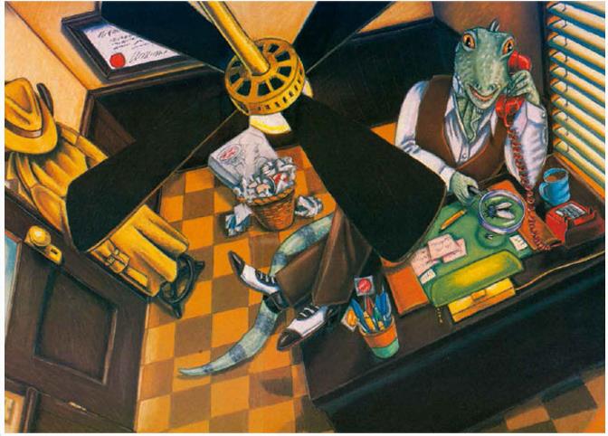 这本书讲的是一名侦探,应一只痛苦的蜥蜴的要求,寻找一条难以捉摸的变色龙的故事,插图极具特色。