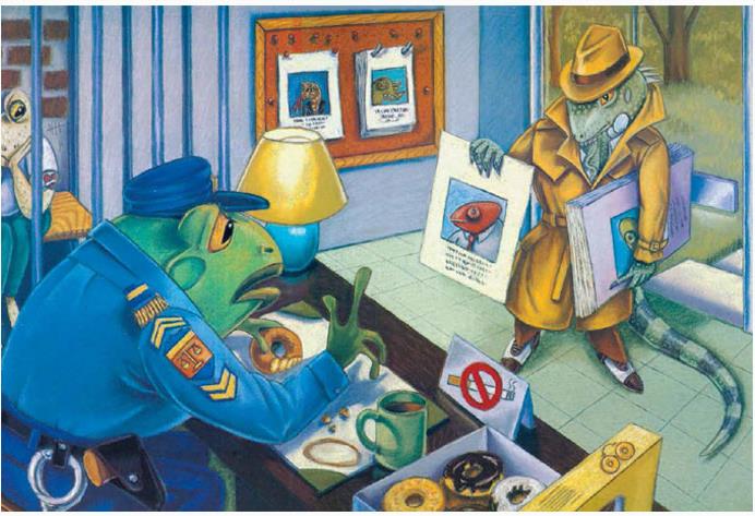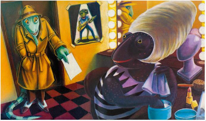 这本了不起的小书,充满了色彩鲜艳的插图和大量的双关语(口头的和视觉的,有些是真正的笑话)。侦探电影里一个友好狡黠的眨眼、美丽客户的絮絮叨叨、迷人的夜总会歌手、失踪的丈夫和具有鬣蜥先生独特风格的毛呢帽子和腰带式风衣……这些对小读者无不是一种完美开场,对父母也是一种享受。