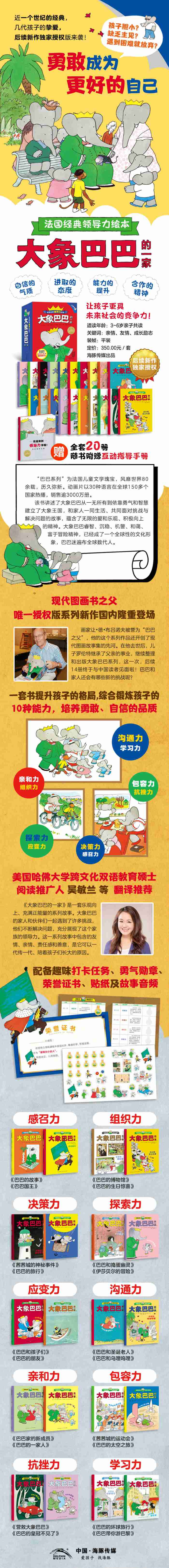 孩子胆小?缺乏主见?不敢表达自己的观点?领导力是孩子综合能力的体现,自信的气质,自律的管理,好的习惯养成。它一种发自内心的激情和热忱,驱动自身做更好的自己,为自己和他人带来正面影响的能力。是孩子未来应该具备的重要能力! 《大象巴巴的一家》一套共20册,为现代儿童图画书之父与其子共同完成的经典力作。动画片以30种语言在全球150多个国家热播,销售逾3000万册。本套作品包含其子劳伦特·德·布吕诺夫后续创作的14册新故事,续写了大象巴巴的经典传奇,国内首次du家引进。 父子俩用充满幽默感的画面和富有想象力的语言,为孩子们创造了一个大象王国的世界。主角大象巴巴和其一家人都是领导力的代言人。故事中,大象巴巴从一无所有到依靠勇气和智慧建立了大象王国,和家人一同生活、共同面对挑战与解决问题,蕴含了无限的爱和乐观、积极向上的精神。它睿智、沉稳、机警、和蔼、富于冒险精神,大象巴巴已经成了一个全球性的文化形象,巴巴迷遍布全球数代人。
