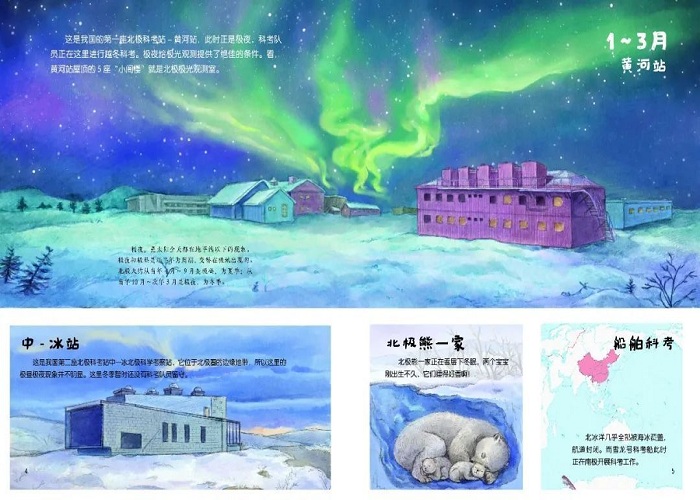 关于北极的科考故事,从一月到十二月整整一年中,分别展示了四条故事线:“黄河站”、“中—冰站”、“北极熊—家”、“船舶科考”,每一页都是四个场景,可以对比观看,也可以追溯其中一条故事线单独阅读,都非常有趣。