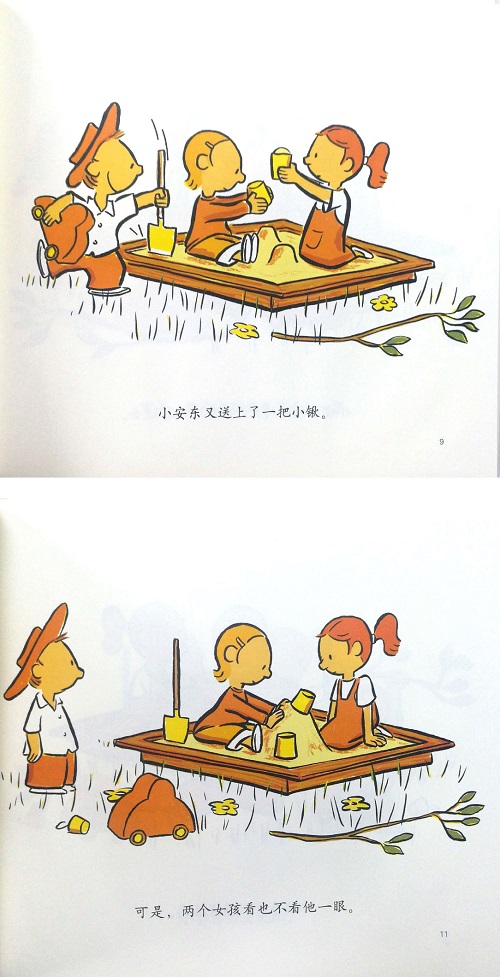 小安东看见两个女孩在沙坑里玩儿。如果能和她们一起玩多开心呀!怎样做才能让女孩邀请自己呢?小安东假装不经意地在女孩们面前大展身手,可是,女孩们连看也不看他一眼,真让人着急。小安东到底该怎么办呢?