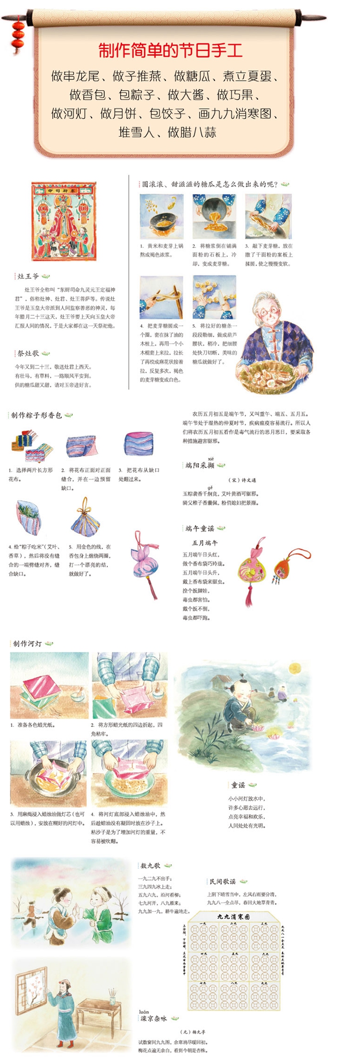 仪式教育可以成为一种重要的家庭教育方式,传统节日正是通过仪式让孩子们亲近和重温古老的风俗习惯。不仅如此,本丛书还特意发掘和介绍了众多的传统游戏,激发他们对传统文化的兴趣。