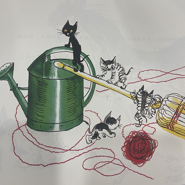 丽莎奶奶坐在门前织毛衣,小猫毛利和鲁丽一左一右睡在她身边。