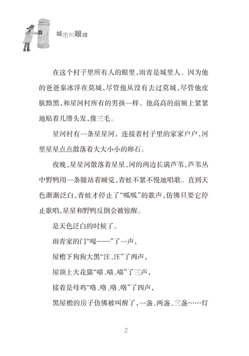 在这个村子里所有人的眼里,雨青是城里人。因为他的爸爸秦冰洋在莫城,尽管他从没有去过莫城,尽管他皮肤黝黑,和星河村所有的男孩一样,他高高的前额紧紧地贴着几缕头发,像三毛。