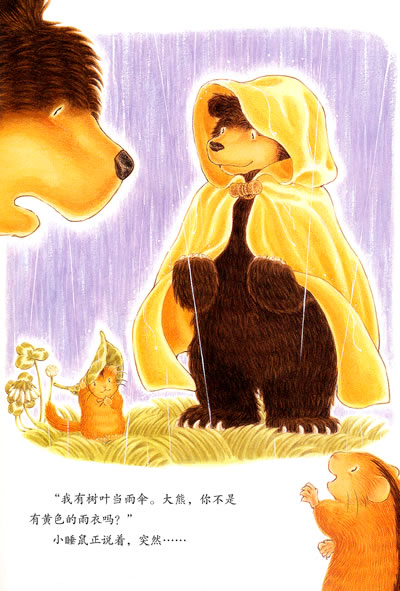 雨天的礼物——一天,森林里下起了暴风雨。大熊吓得躲在被子里发抖。小睡鼠独自跑进雷雨中,到七色谷为大熊采紫阳花。后来,山洪暴发了,大熊惦记着小睡鼠的安危,不顾一切地跑向七色谷……这是一个关于勇敢和友谊的故事,从中可感受到友情的神秘力量。