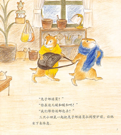 一个大雪天,兔子邮递员给三只小田鼠送来了住在山那边的外婆织的漂亮围巾。