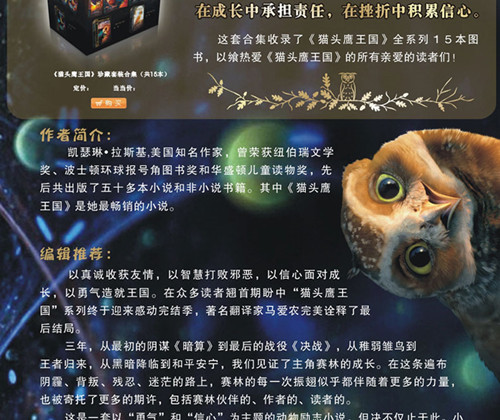 这是一套将动物习性与人性和奇幻完美结合的力作,被美国媒体誉为“综合并凌驾于《哈利.波特》和《快乐之足》之上,在现实和想象中任意驰骋的佳作。”