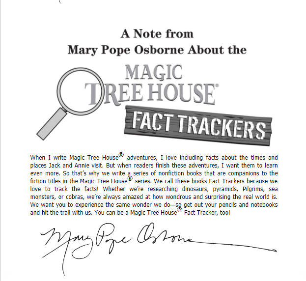 Filled with up-to-date information, photos, illustrations, and fun tidbits from Jack and Annie, the Magic Tree House Fact Trackers are the perfect way for kids to find out more about the topics they discovered in their favorite Magic Tree House adventures. And teachers can use Fact Trackers alongside their Magic Tree House fiction companions to meet common core text pairing needs.