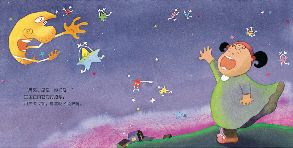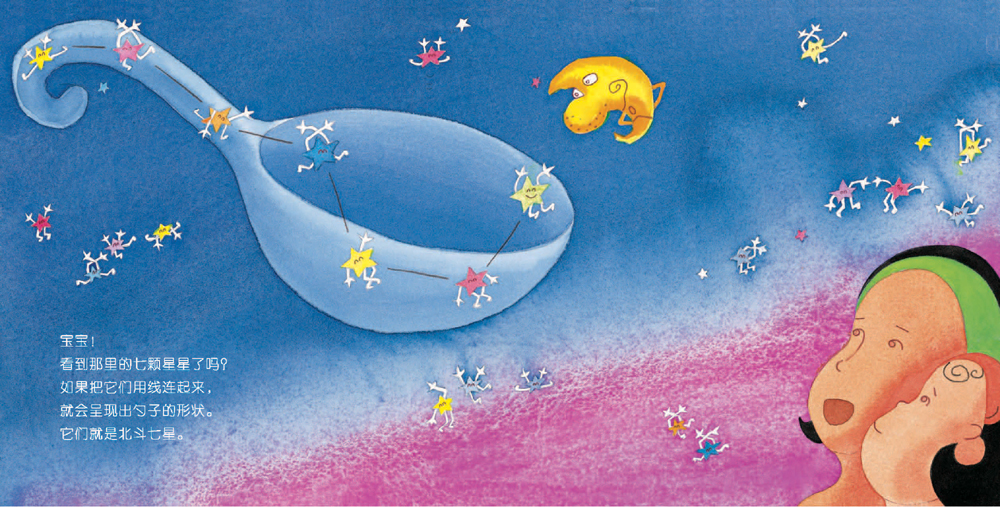 宝宝,你看到在漆黑的夜空中,闪闪发光的星星了吗?宝宝!看到那里的七颗星星了吗?如果把它们用线连起来,就会呈现出勺子的形状。它们就是北斗七星。啊哈!那里还有熊妈妈和小熊呢。你觉得不像吗?可那是人们命名的星座:大熊座、小熊座。“月亮、星星,你们好!”宝宝在向它们打招呼。月亮笑了笑,星星眨了眨眼睛。……