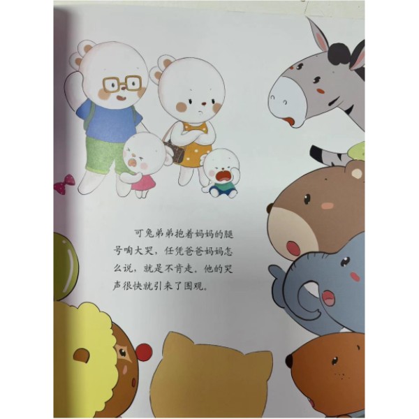 这套书一共8册,8个故事,解决8个行为问题,分享8种幸福的智慧。 《不想上晚接班》 一直照顾孩子的兔爷爷和兔奶奶离开了,工作忙碌的兔爸爸和兔妈妈开始了独自带娃,他们担心歪歪兔姐弟俩在幼儿园晚接班会孤单,对孩子既内疚又心疼……面对鸡飞狗跳的生活,兔爸爸和兔妈妈决定不焦虑,积极解决了问题,还让孩子们明白了,每个家庭都有自己特殊情况,接纳就好,不管怎么样,一家人在一起努力,生活总能幸福美满。 《穿衣服的战争》 孩子总喜欢自作主张地穿一些不合时宜的衣服,尤其是在早上上学前,越忙越添乱。歪歪兔就是这样,要穿着睡衣去学校,要穿着裙子去爬山……其实这是孩子在和爸爸妈妈争夺权力呢,决定自己穿什么的权力。看看聪明的兔爸爸和兔妈妈是如何化解这一场“权力之争”的。