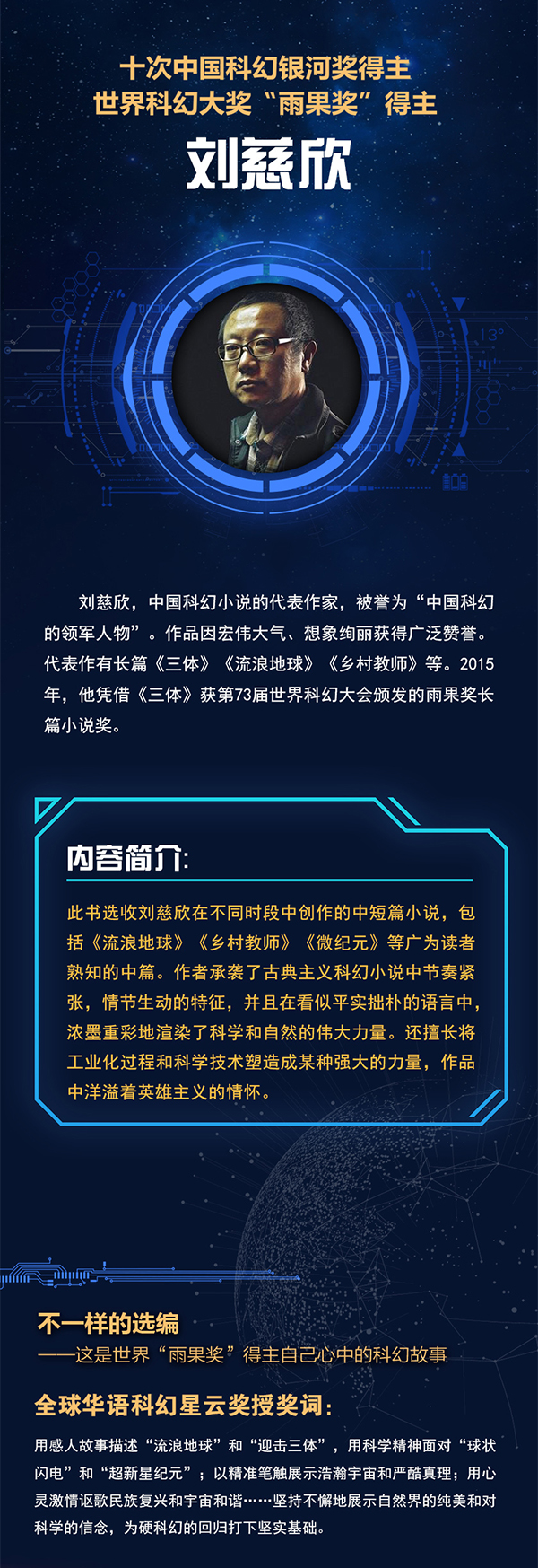 用感人故事描述"流浪地球"和"迎击三体",用科学精神面对"球状闪电"和"超新星纪元";以精准笔触展示浩瀚宇宙和严酷真理;用心灵激情讴歌民族复兴和宇宙和谐……坚持不懈地展示自然界的纯美和对科学的信念,为硬科幻的回归打下坚实基础。