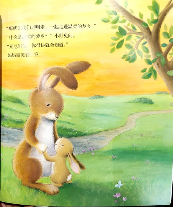 太阳快要落山了,野兔妈妈对小野兔说:“乖乖,我们该回家睡觉了。”可是,小野兔一点儿也不觉得累。于是,野兔妈妈说:“那就让我们一起走啊走,走进温柔的梦乡吧!小野兔不知道什么是温柔的梦乡,不过他还是很高兴地踏上了旅程。路上,他们碰到了小老鼠,小老鼠陪着小野兔蹦蹦跳跳玩了好一阵子,可是小野兔依就精神满满,一点儿也没有犯困的样子。接着,她们又遇到了家兔妈妈一家、白马和猫头鹰,他们建议小野兔填饱肚子、听听睡前故事,或者听个摇篮曲也行。经历了这么一番折腾,小野兔终于有点疲倦了,野兔妈妈轻轻地牵起了小野兔往家里走。到家的时候,小野兔终于走进了甜蜜的梦乡。